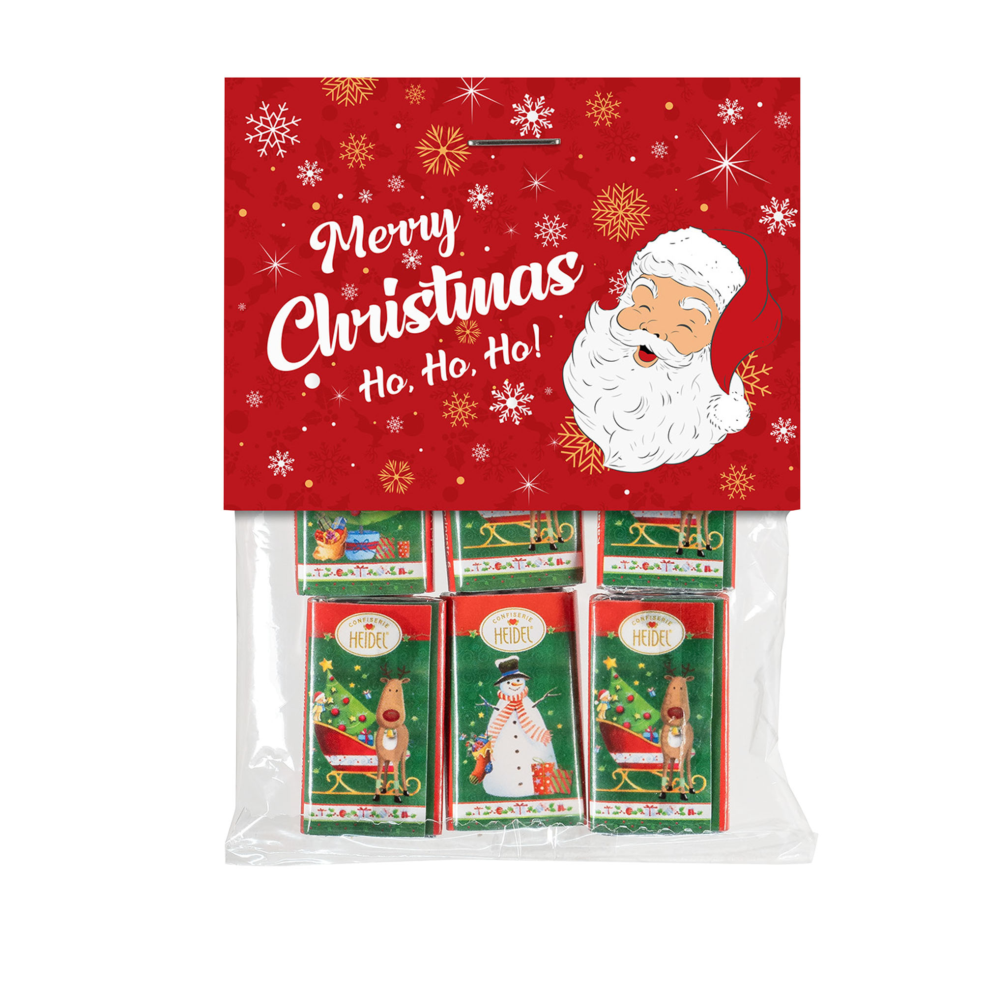 1 Beutel mit 6 Mini-Schoko-Täfelchen Napolitains je 3 g (einzeln verpackte Mini-Täfelchen aus Edel-Vollmilch-Schokolade mit verschiedenen Weihnachtsmotiven) verpackt in einem Folientütchen mit Standard-Reiter „Merry Christmas“.