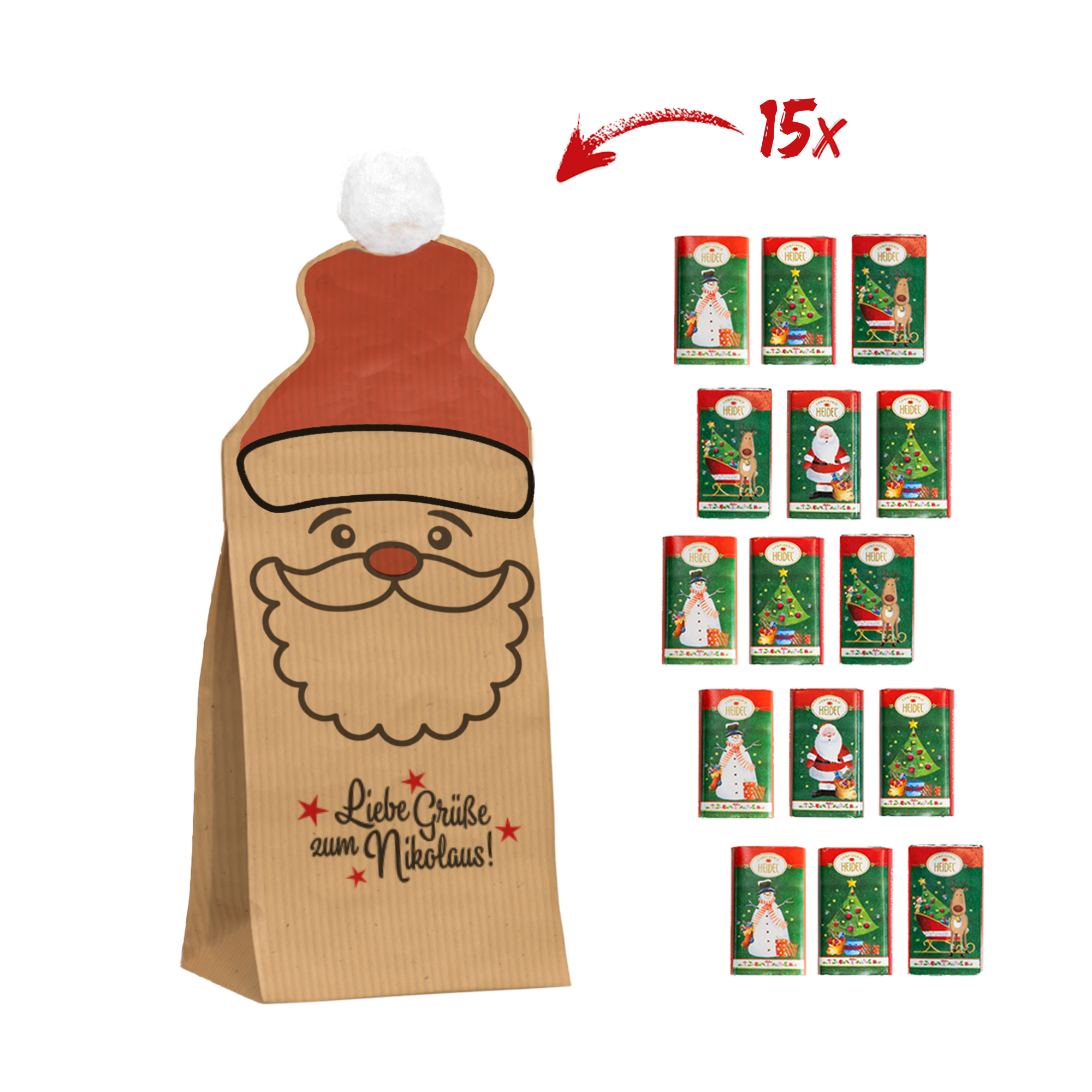 1 Nikolaustüte aus Papier mit Standard-Druck „Alles Liebe zum Nikolaus“, gefüllt mit 15 Napolitains je 3 g (einzeln verpackte Mini-Täfelchen aus Edel-Vollmilch-Schokolade mit verschiedenen Weihnachtsmotiven, Sortierung kann von der Abbildung abweichen). • Die Nikolaus-Tüte kann mit einem 4c Druck, 1c Druck oder einem 4c Aufkleber individualisiert werden.